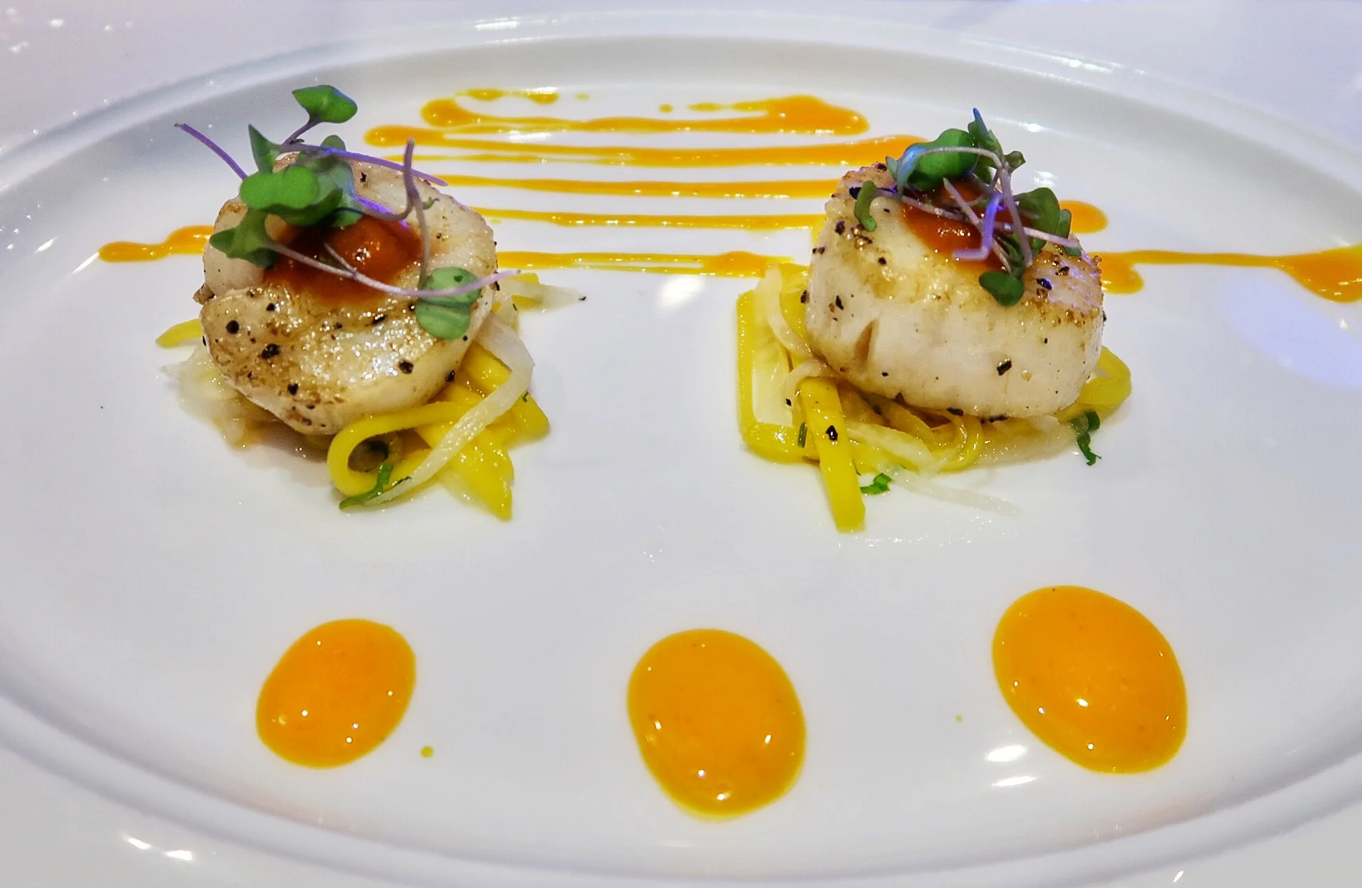 Clay oven roasted diver sea scallops with a grilled mango and pickled jicama slaw, tomato chutney and chili mandarin drizzle.