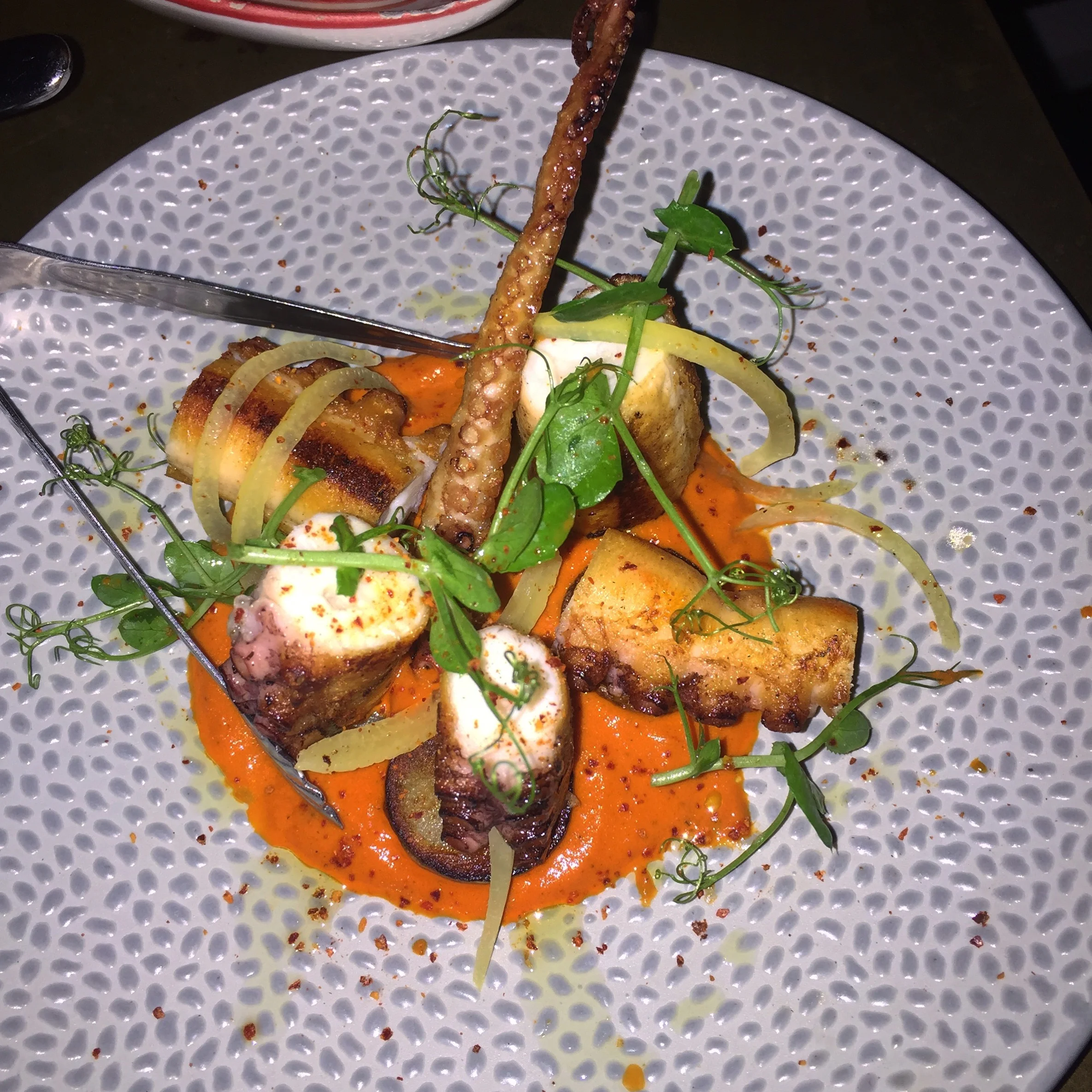 Tender Spanish octopus with fingerling potato, biber chli vinaigrette and preserved lemon.