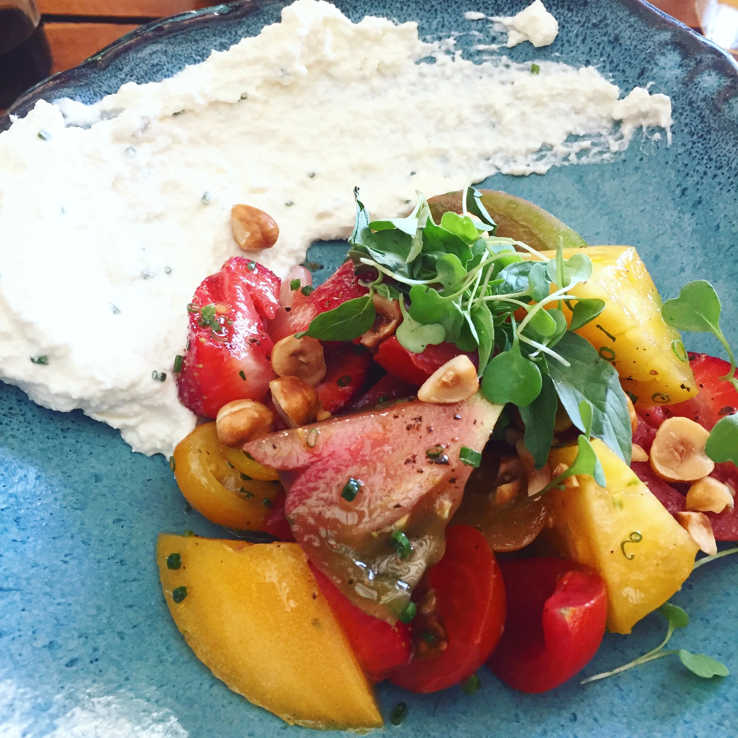 Fresh local tomatoes and strawberries create this beautiful Hierloom Tomato and Strawberry salad with house whipped ricotta and fried hazelnuts.